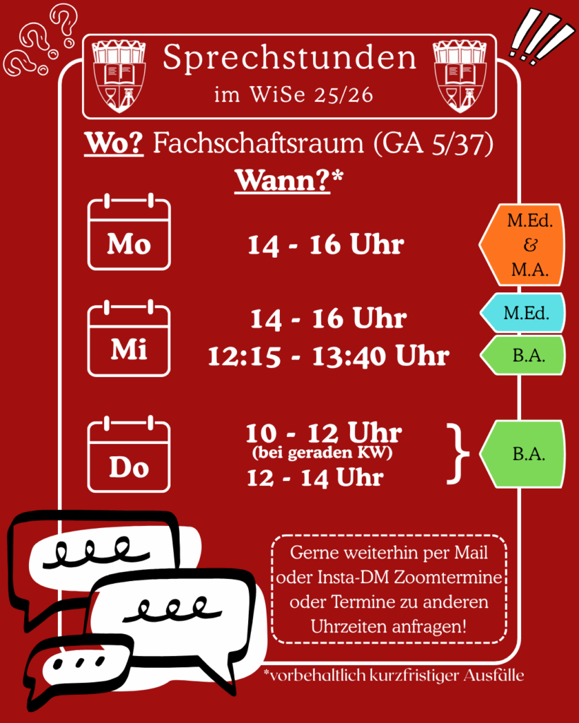 Die Tags am Rand („B.A.“, „M.A.“ und „M.Ed.“) sind nicht verpflichtend, ihr dürft selbstverständlich zu jeder Zeit in die Sprechstunde kommen. Damit wir euch besser weiterhelfen können ist es dennoch empfehlenswert – besonders bei Fragen zu Studienleistungen – den Tags zu folgen, damit ihr FSR-Mitglieder mit demselben Studiengang (und somit auch mit first-hand experience) sprechen könnt.
